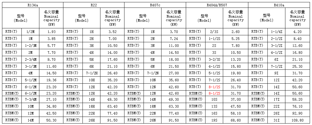 注:名義制冷量是基于蒸發(fā)溫度te=5℃,冷凝溫度tc=40℃,進入膨脹閥液體制冷劑溫度34℃,靜止過熱度4K。