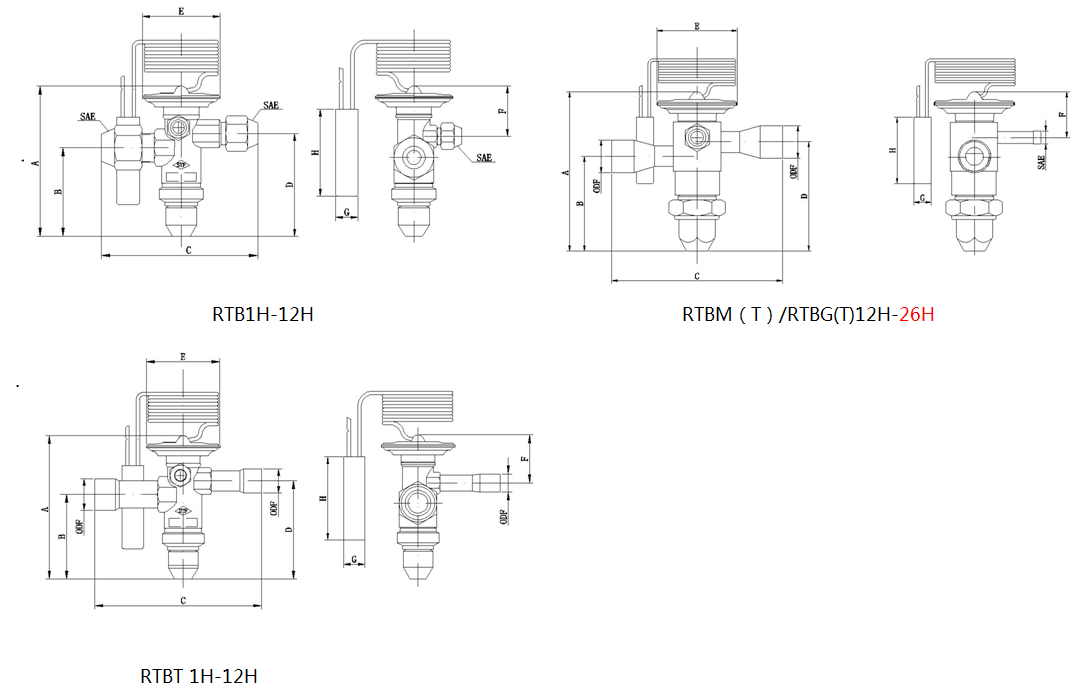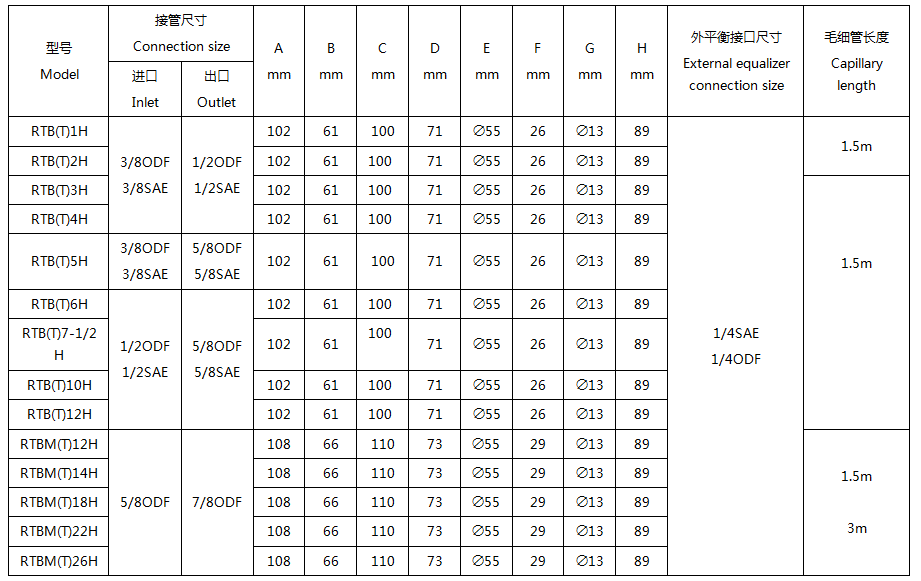 - RTB(T)1H-12H為單閥口型,RTB(T)12H-26H為雙閥口型。